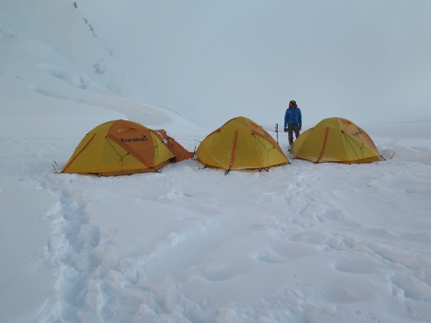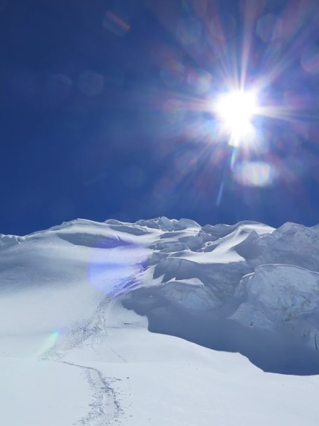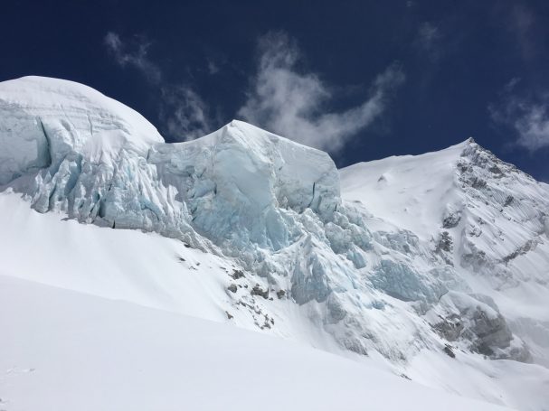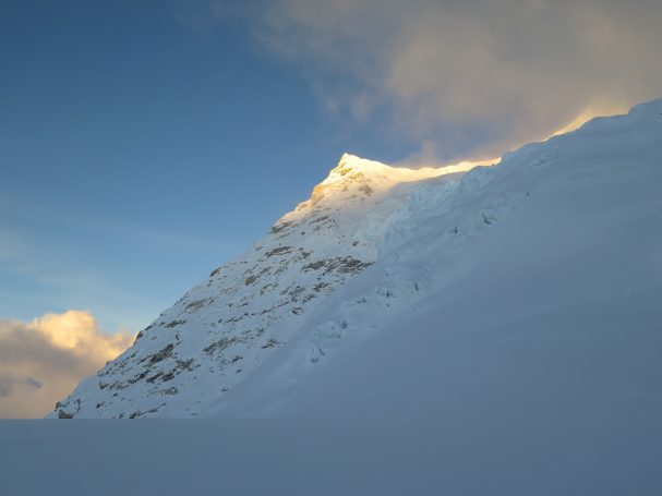 Our first night on the glacier at Camp 1 was unforgettable: a spectacular sunset, tents perched precariously on ice, the route over the serac glowing in the distance.