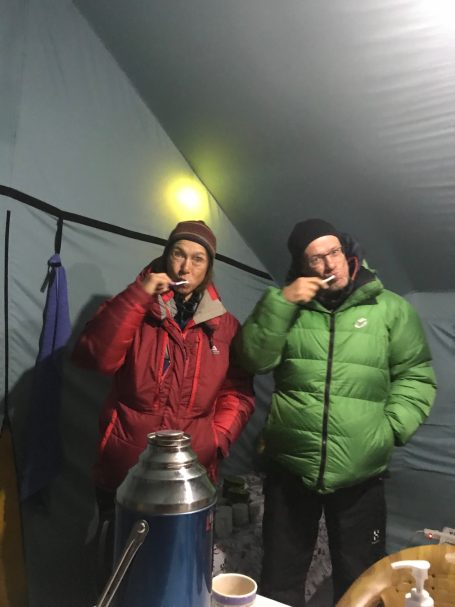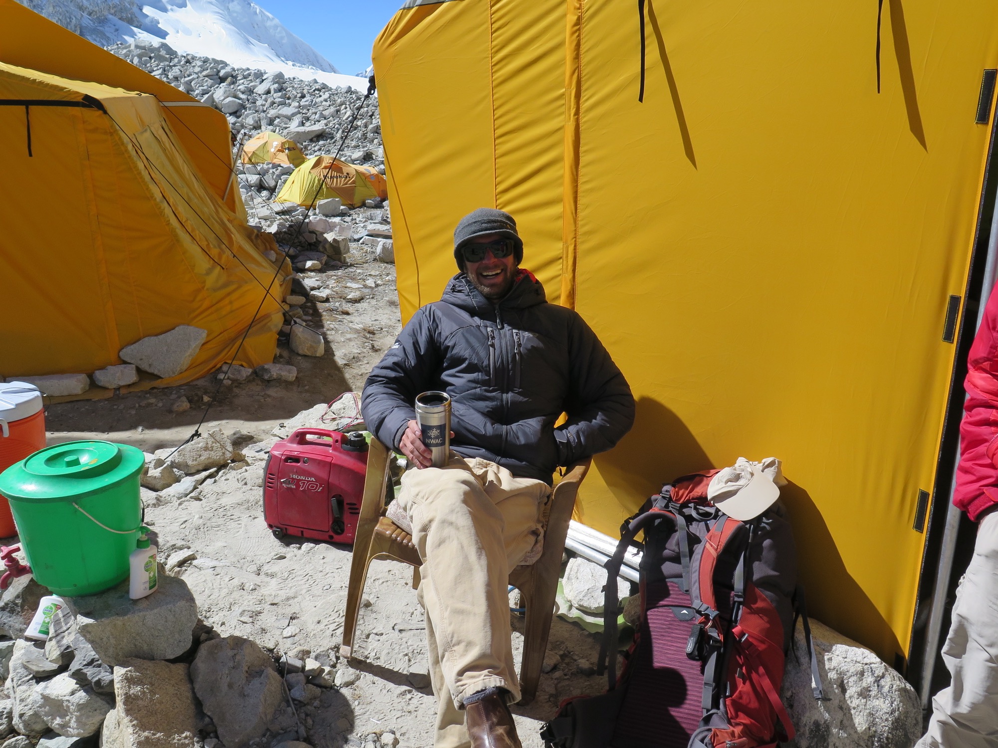Camp life had its own rhythm. Evenings in the dining tent were filled with stories, music, and laughte until it became too cold to stay. By 8 p.m. we retreated to our sleeping bags, where we’d remain until the sun hit camp around 7:30 a.m. Twelve hours in a tent is a long time. I learned to meditate, think, read, nap, and then repeat the process around 1 a.m. Such is the life of a high-altitude climber.
