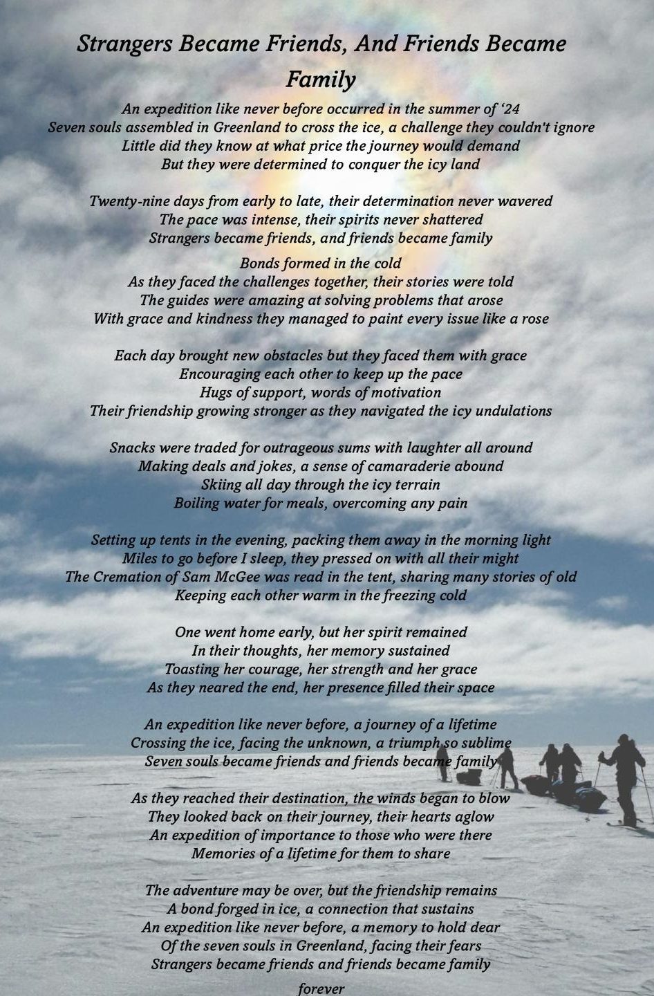 The group consisted of seven people, six of whom had previously met for a "shakedown" in Minnesota a few months earlier. We formed a strong bond in Februrary and learned about each other. The Ice Cap adventure was a once-in-a-lifetime event. Each teammate was more than another person on the journey. We helped each other on the bad days. We laughed at the funny and stupid stuff. We hunkered down when thing got bad. We hugged each other in good times and bad.