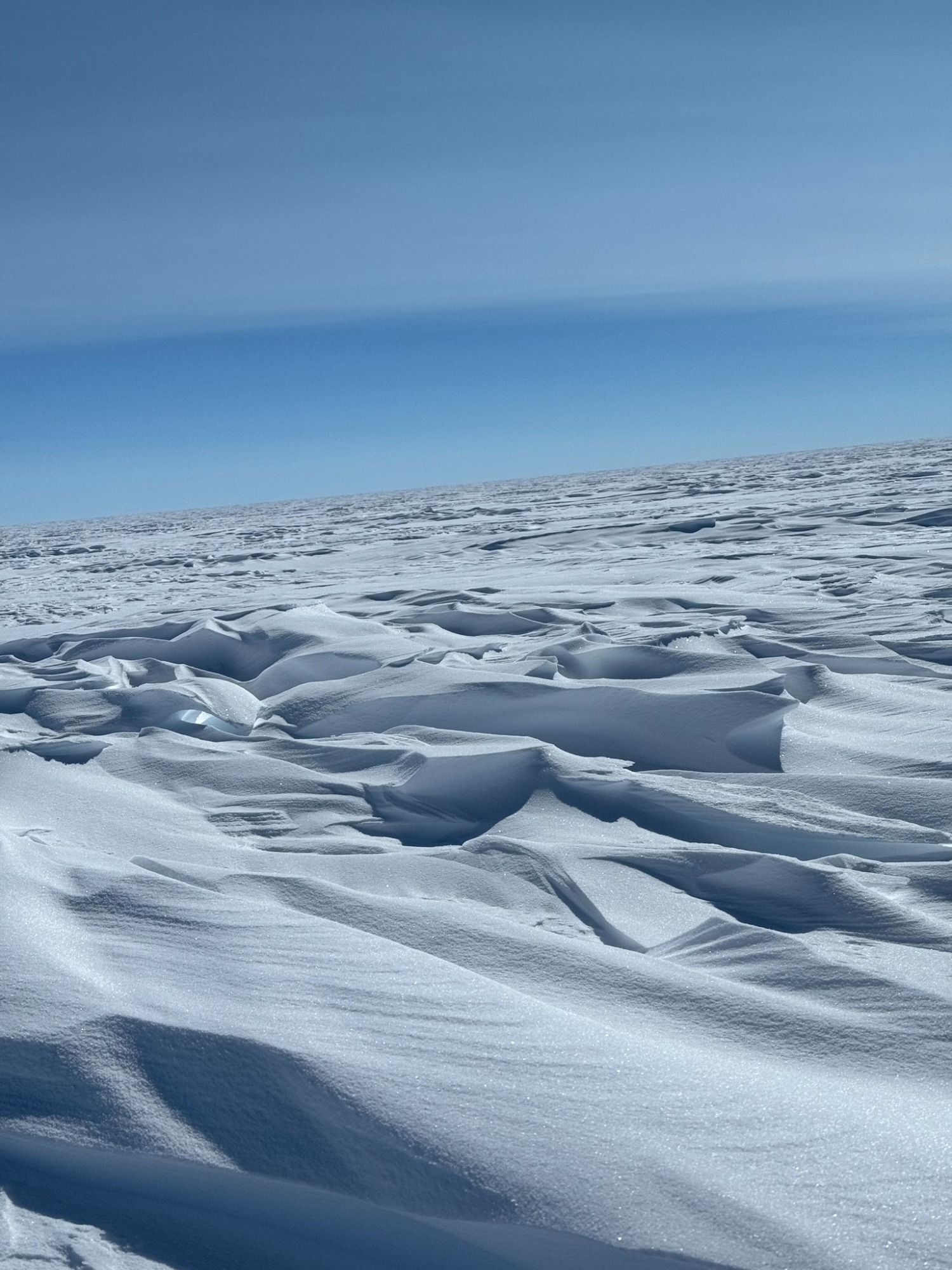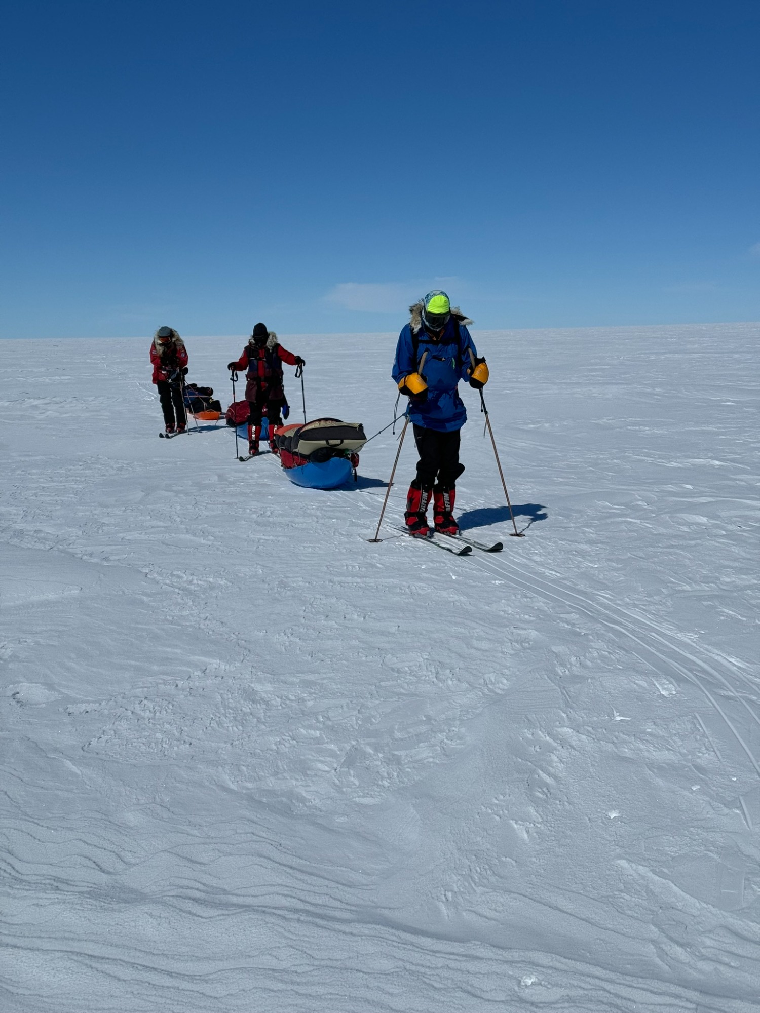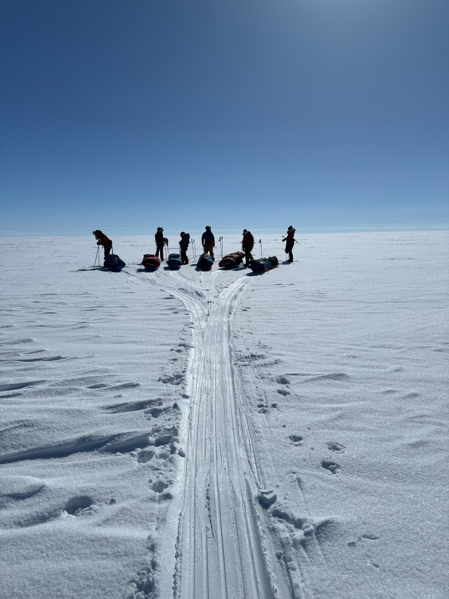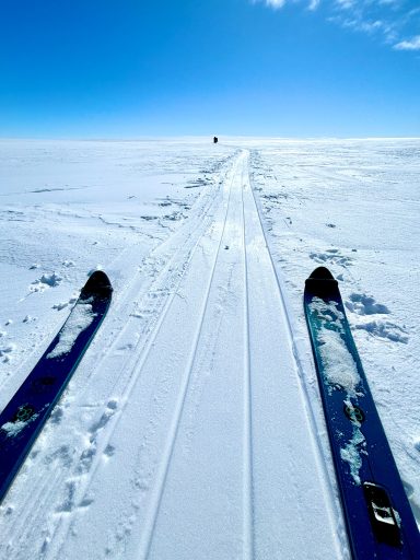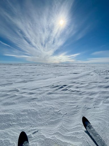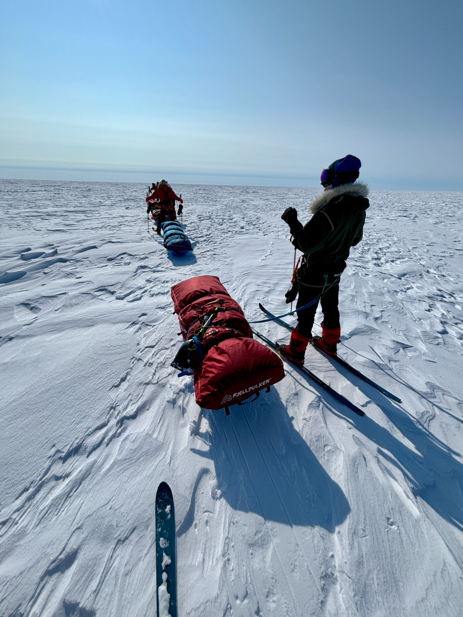 A few days later, the ice turned friendlier - just enough that we could look around, breathe, and appreciate the vastness. Day 6 was one of my best. I put on 70’s rock, let my mind drift, and felt the rhythm of skiing return. The wind was down, the sky open, the snow smooth. The world felt wide and clean. We would take turns leading. Mostly it was either Chris or Annie, but the rest of us also took turns and learned the art of navigating.