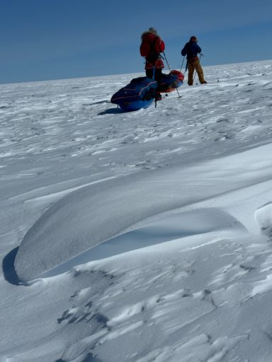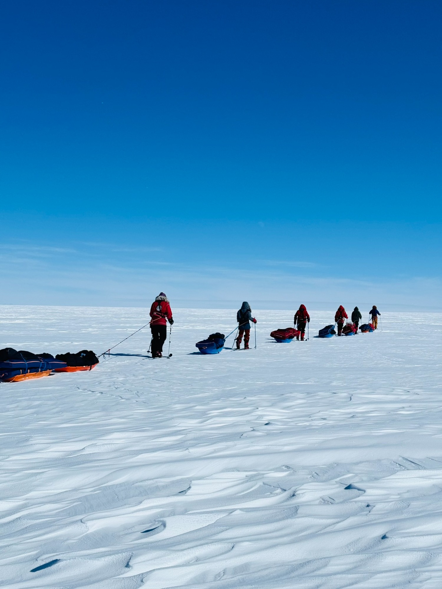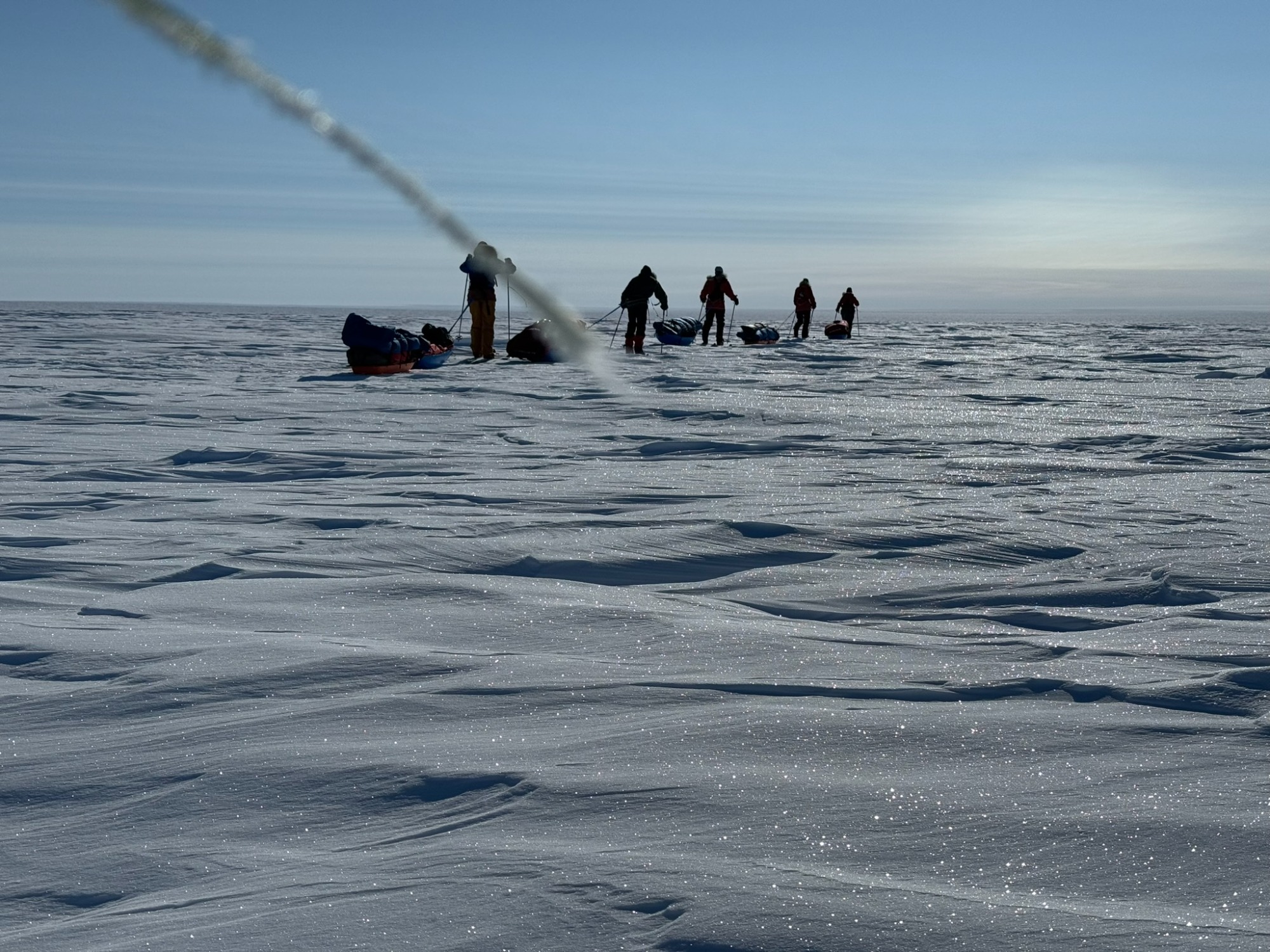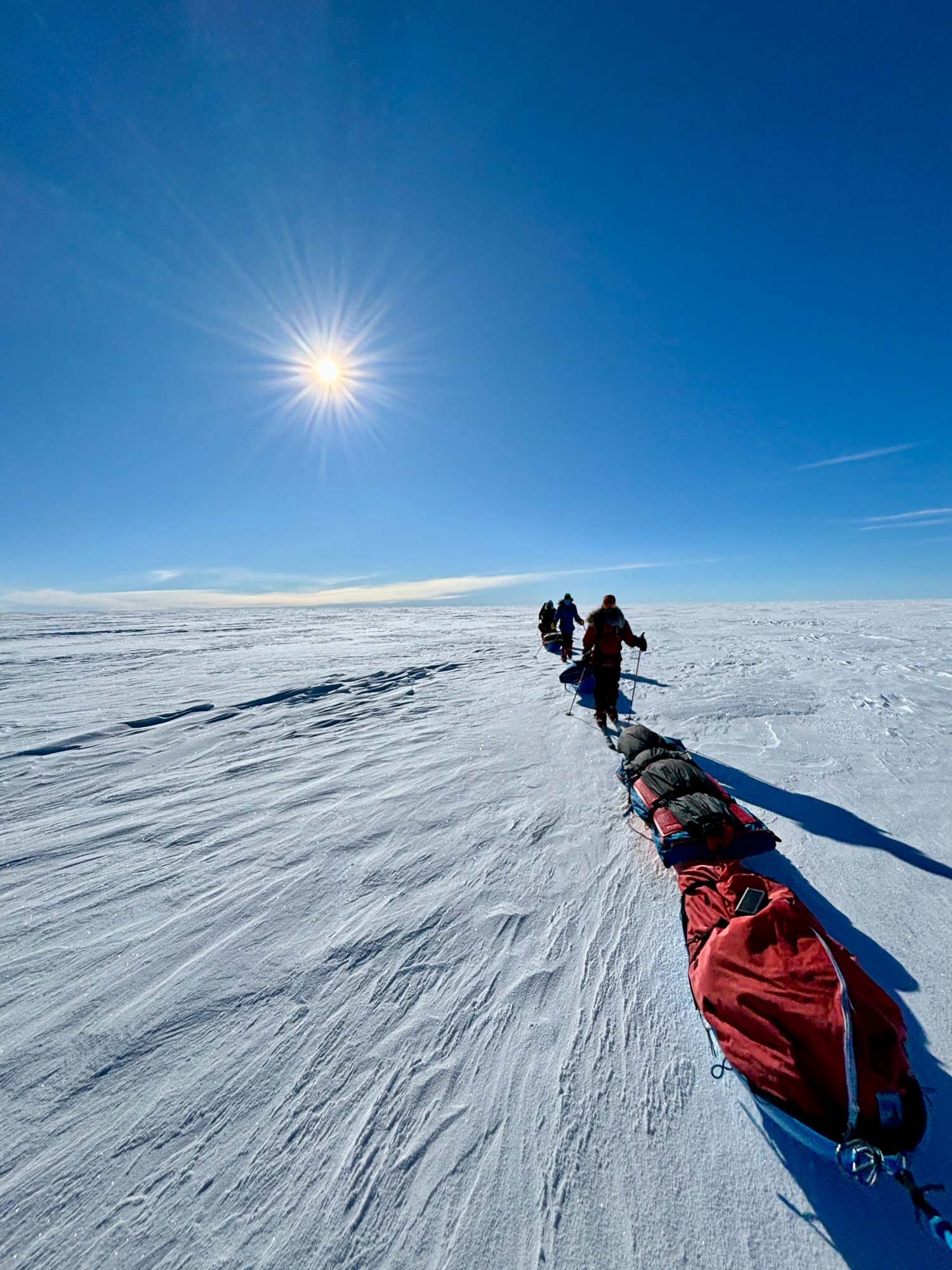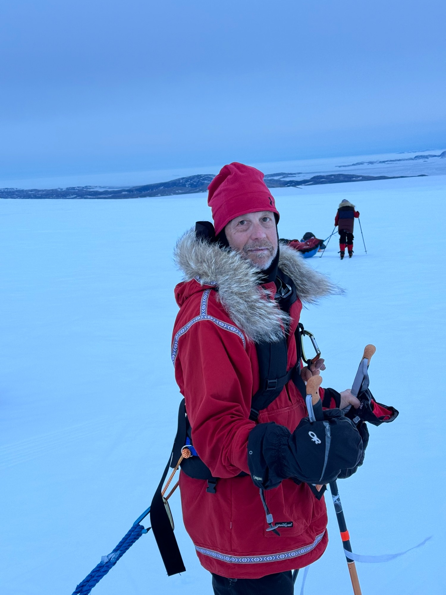 A few days later, the ice turned friendlier - just enough that we could look around, breathe, and appreciate the vastness. Day 6 was one of my best. I put on 70’s rock, let my mind drift, and felt the rhythm of skiing return. The wind was down, the sky open, the snow smooth. The world felt wide and clean. We would take turns leading. Mostly it was either Chris or Annie, but the rest of us also took turns and learned the art of navigating.