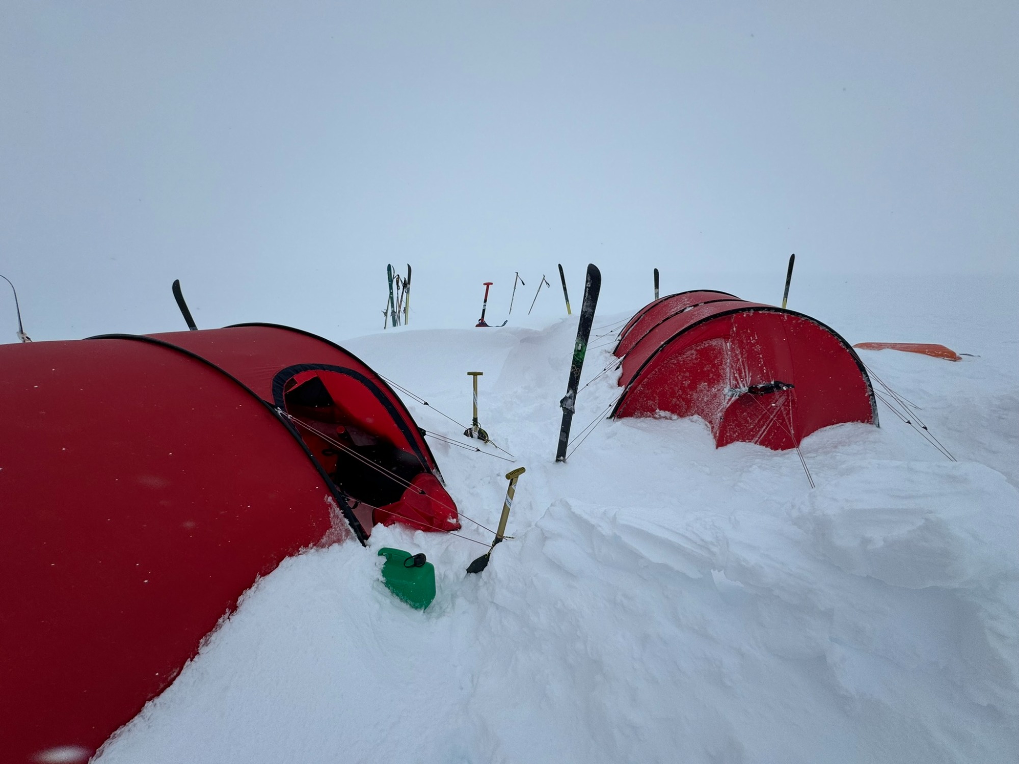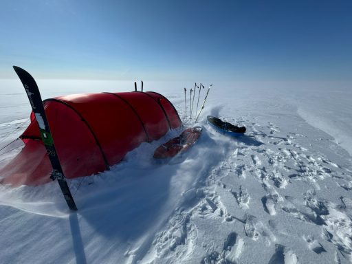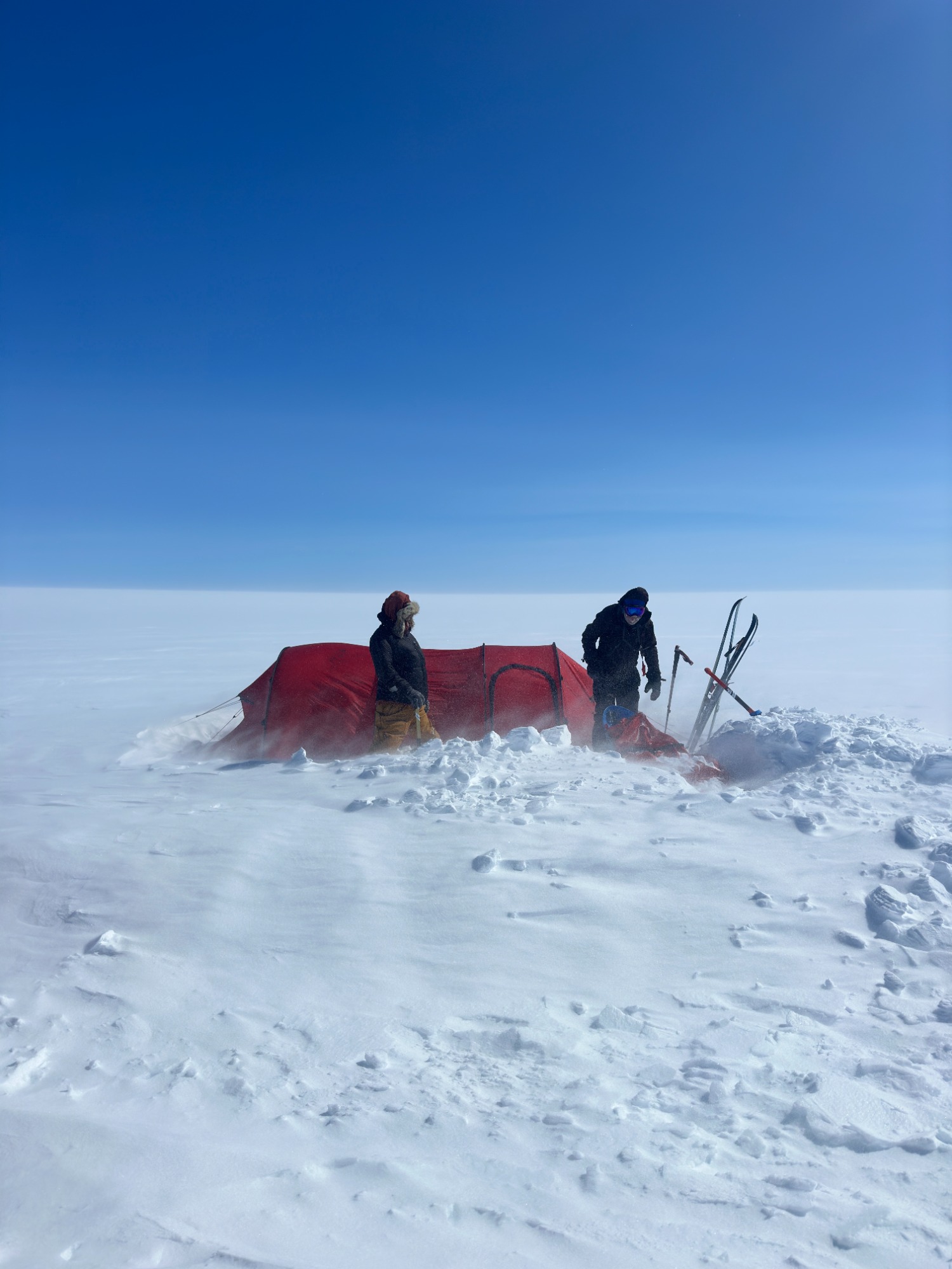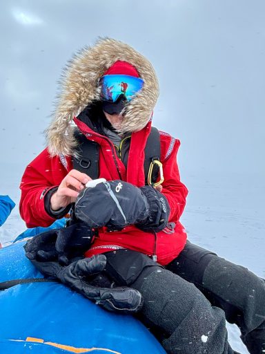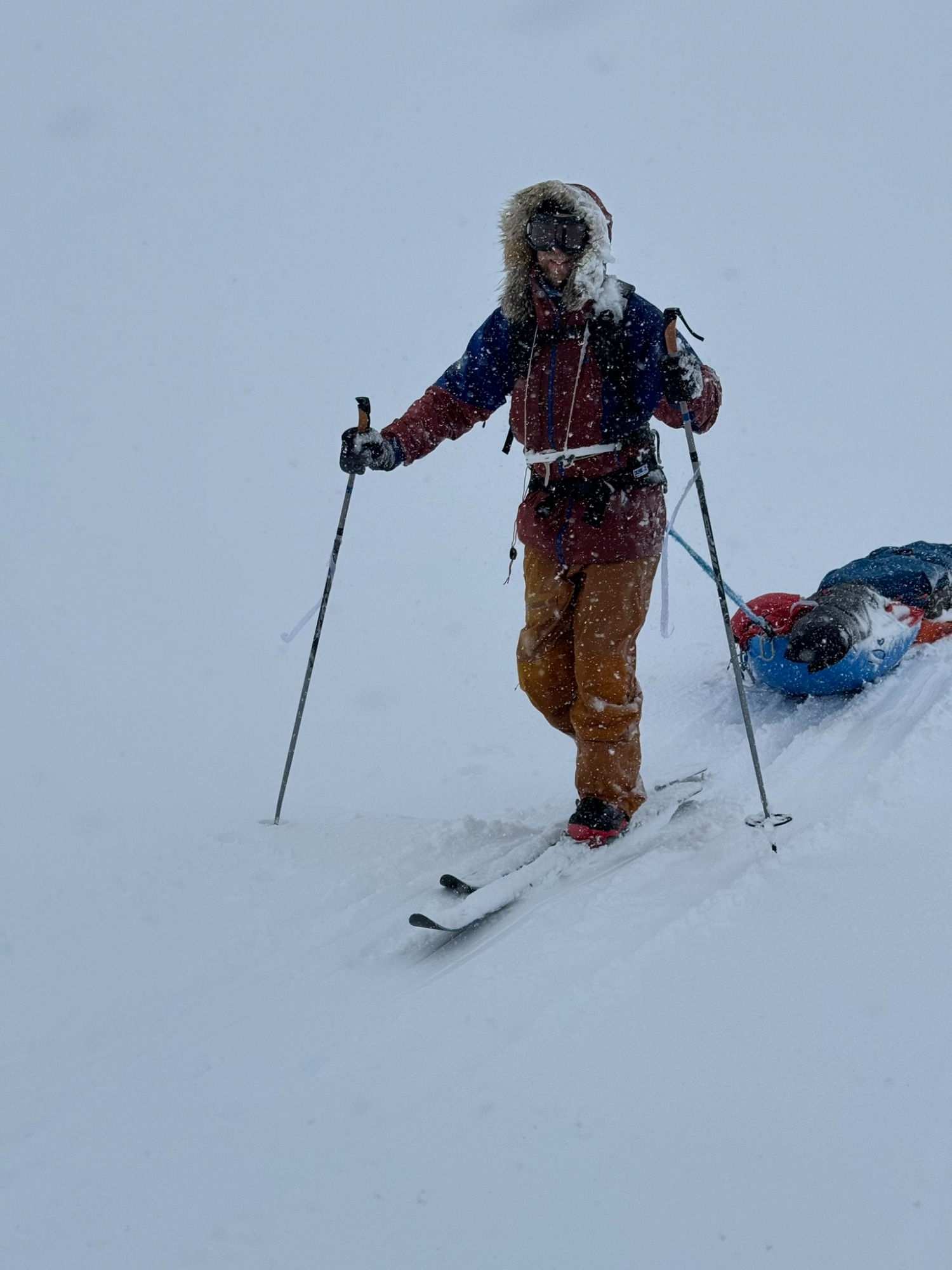 Whiteouts swallowed the horizon. Gusting winds buried our skis and poles overnight. Morning began with digging ourselves out of tent-side snowdrifts. Yet the routine - wake, wipe down, tape feet, boil snow, break camp - became almost comforting. Each of us learned new efficiencies: I trimmed my “tent kit” to just two stuff sacks and my pitaraq bag, which made transitions smoother.