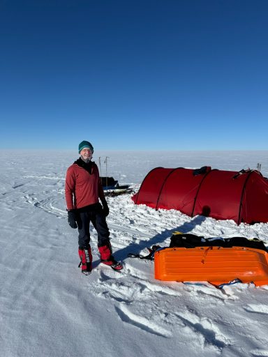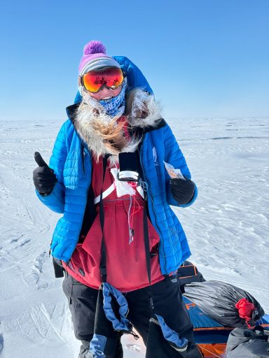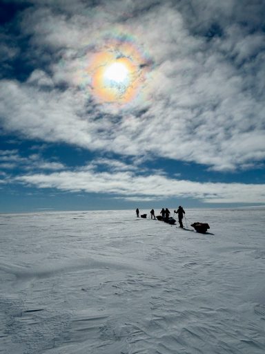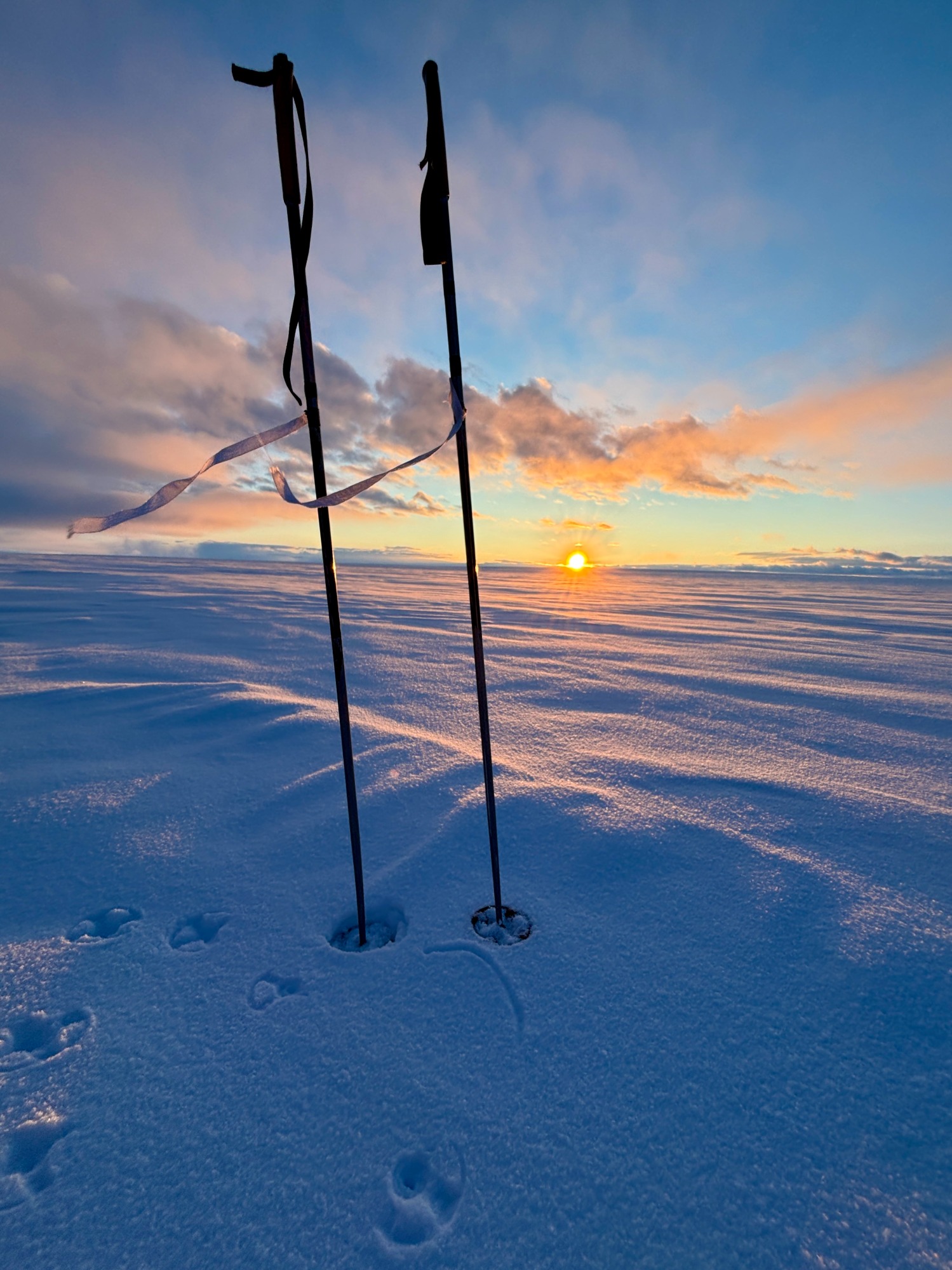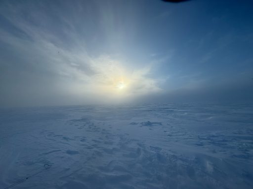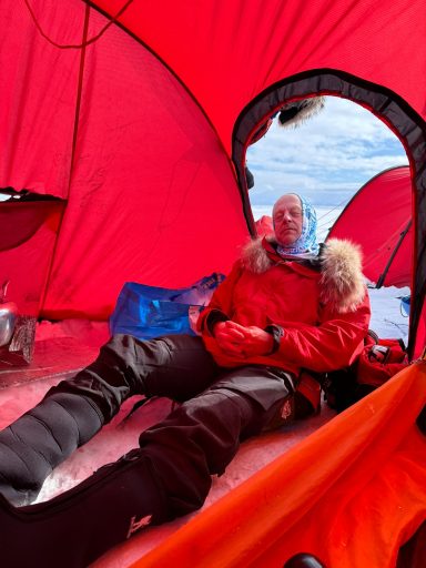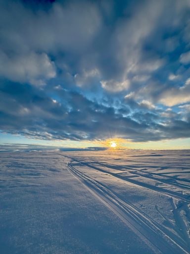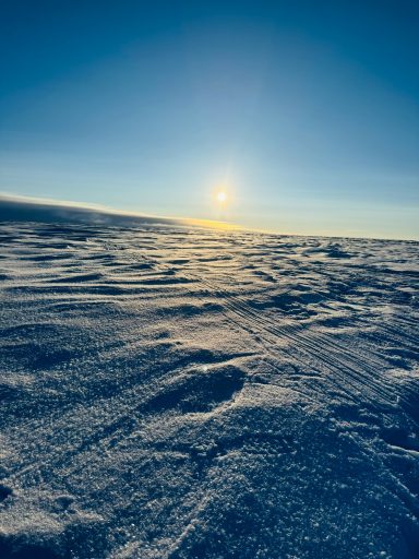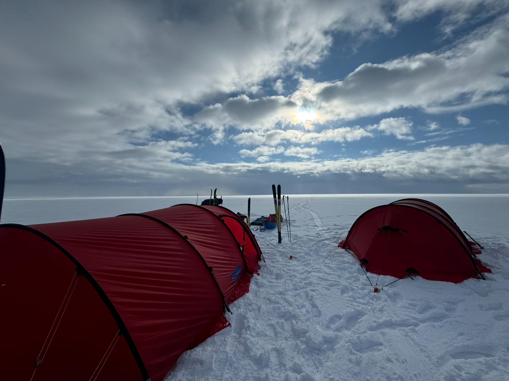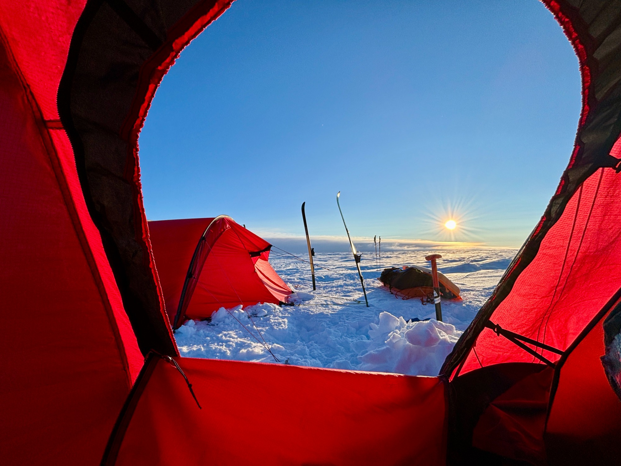 Day 27 offered redemption: 32 kilometers in a wild, extended push that carried us past midnight, under a sun that refused to set. The sky glowed orange on the horizon, and the snow glittered like crushed glass. But the cold bit hard at the end, and my hands went numb again. I arrived at camp trembling, and once more the others ushered me straight into a tent.