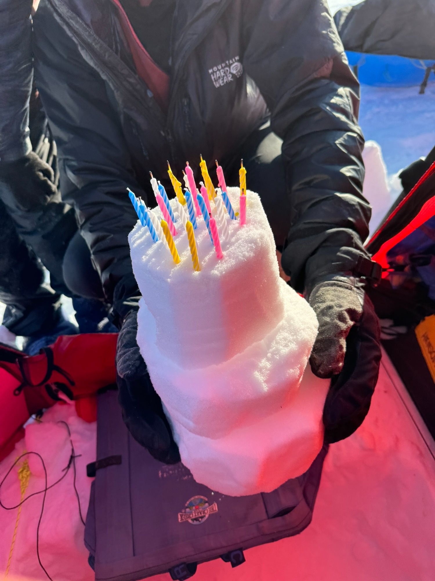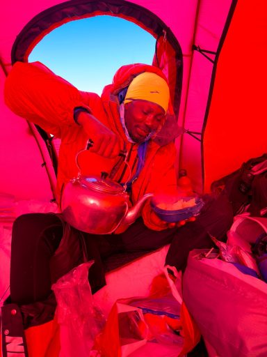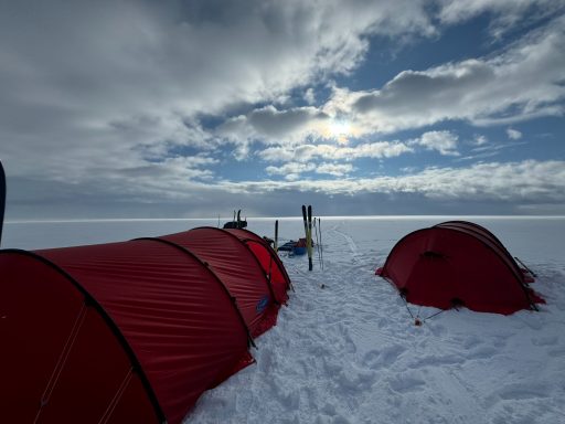 Day 3 greeted us with 25 mph winds and near-zero temperatures. Breakfast was an exercise in keeping fingers functional. Some teammates were struggling with their climbing skins; others fought with goggles icing over. We met a fast-moving Norwegian team of six who slid past us with the kind of efficiency that makes you question your own competence. Still, by late afternoon the terrain softened, and we finally felt something like progress.