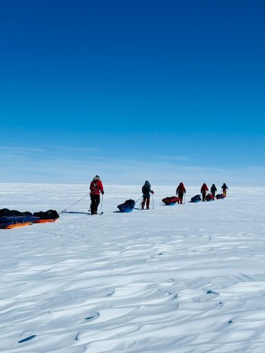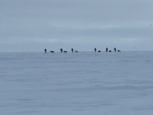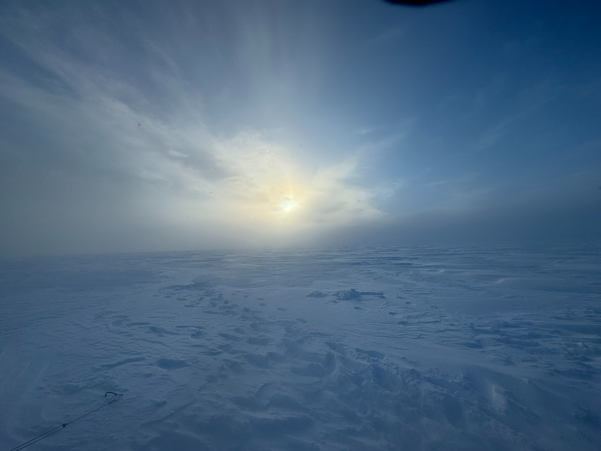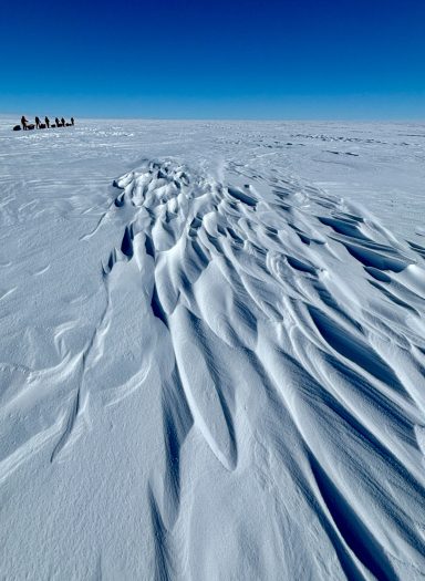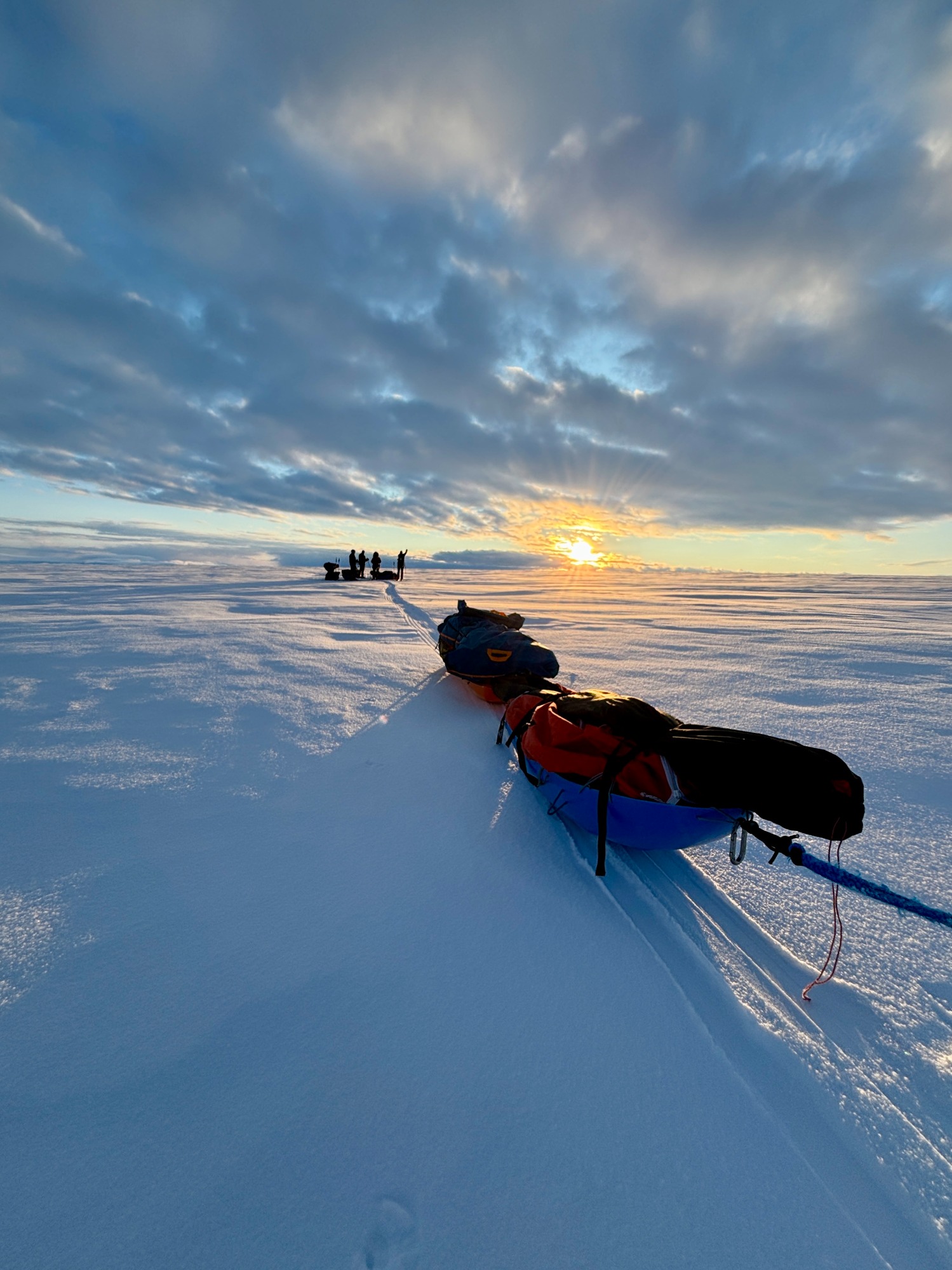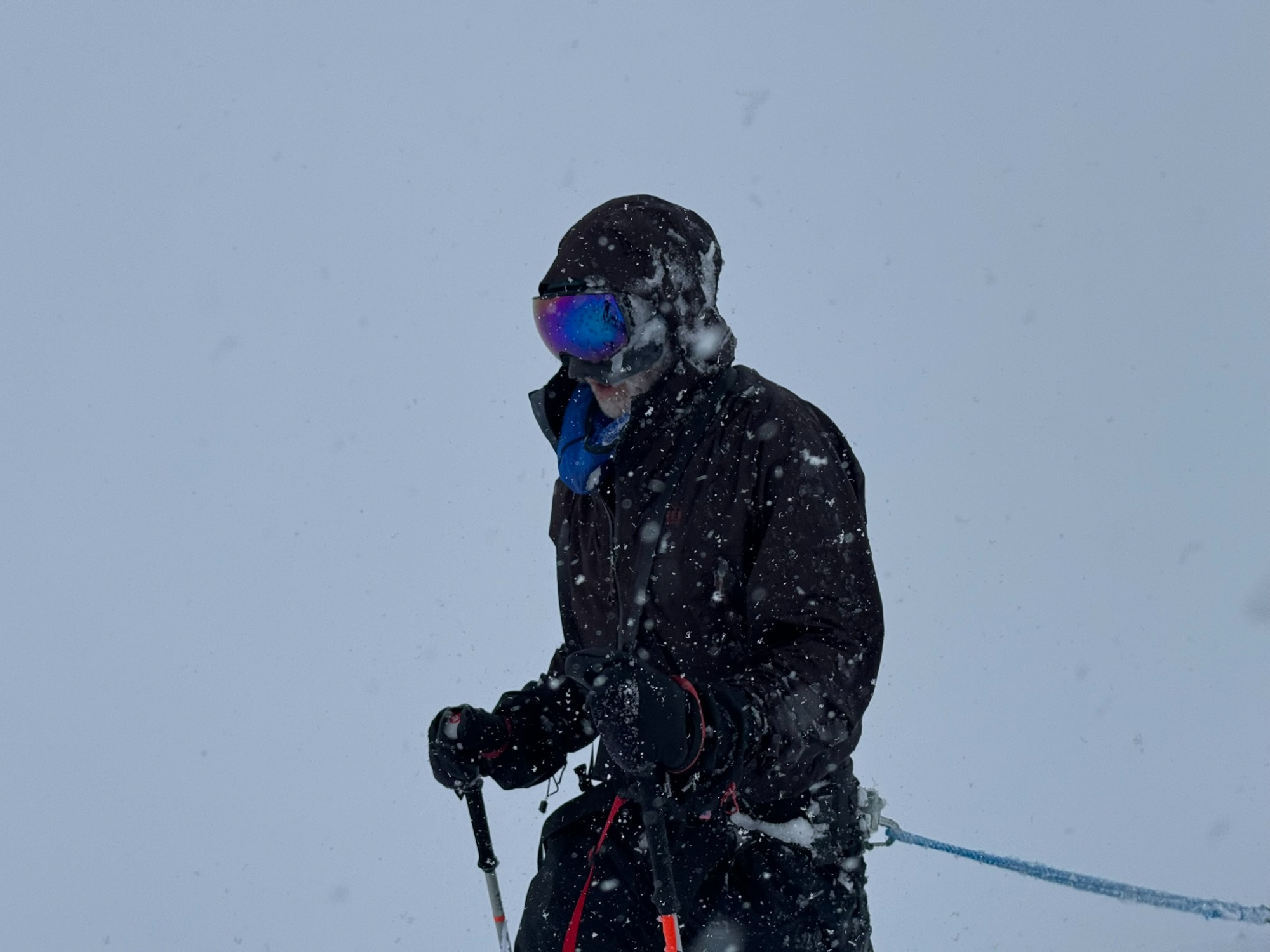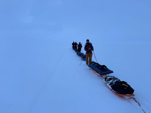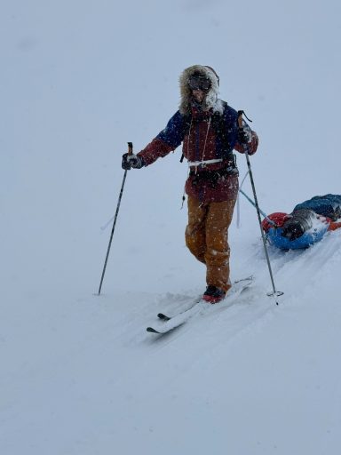 The landscape flattened, turned featureless; distances lost meaning. We skied through blowing snow so thick that the world seemed to shrink to the person in front of you and the rope of their sled.