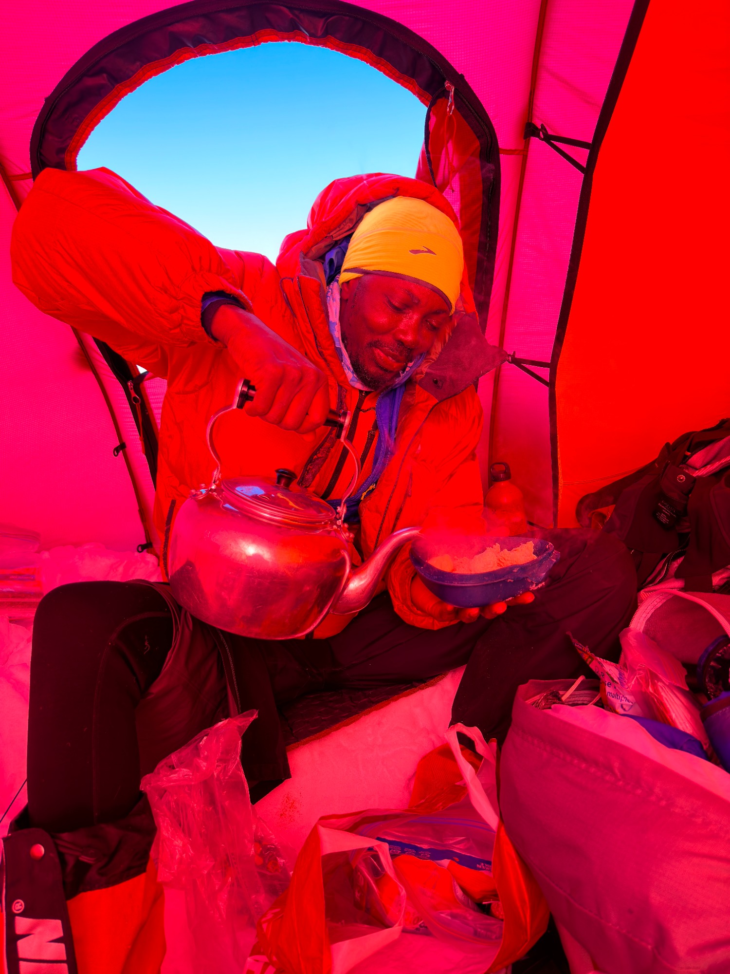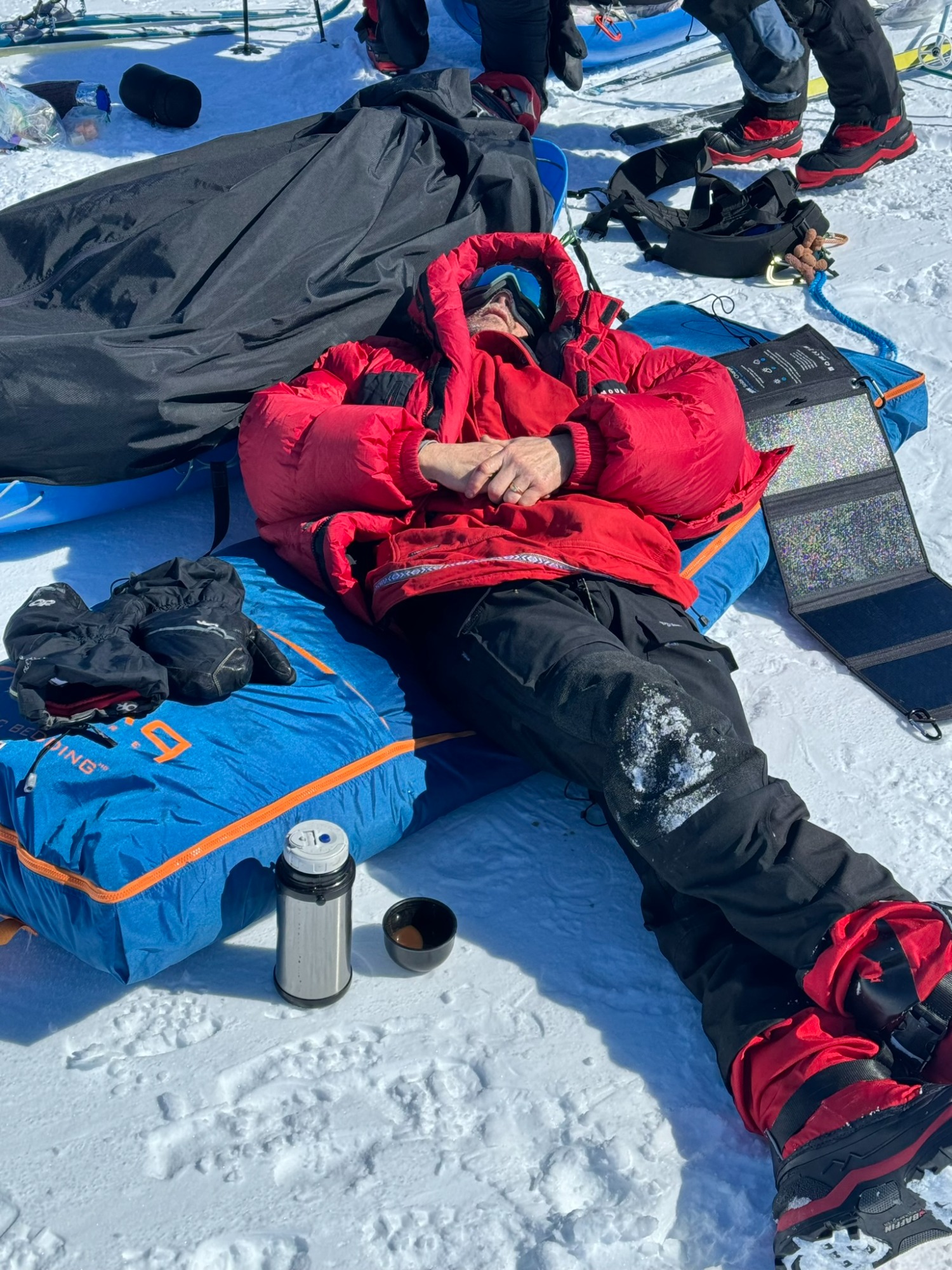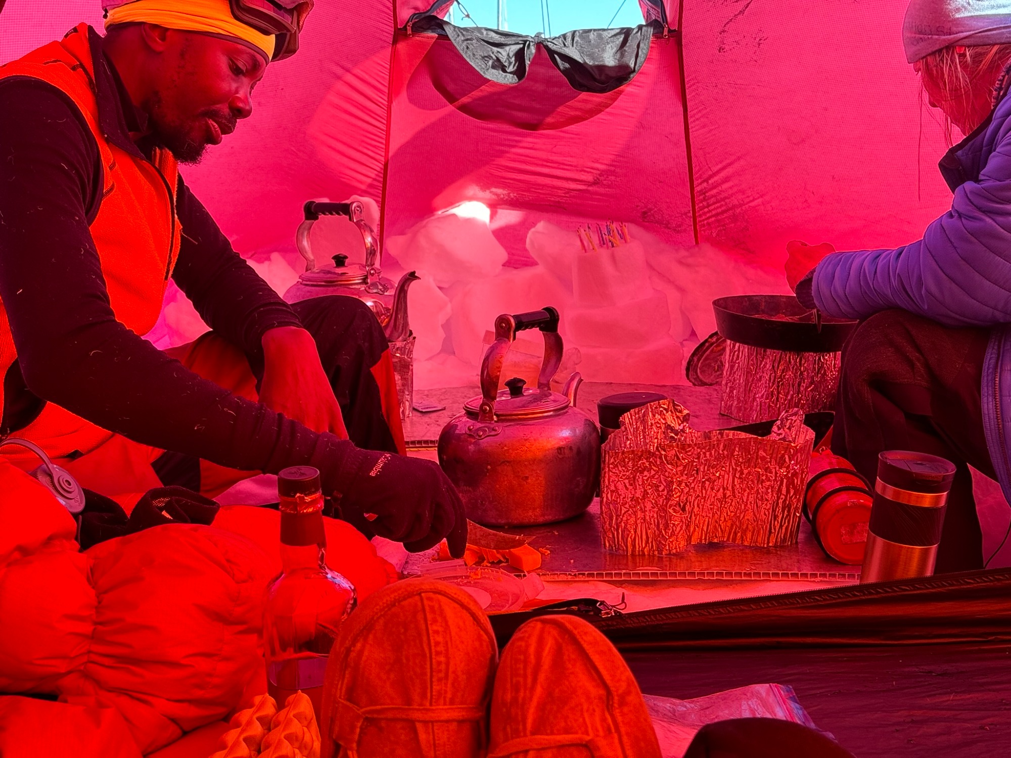 That night I learned the rhythm of living on ice: boiling water from snow, rationing calories you don’t yet crave, stuffing every layer of clothing into your sleeping bag for the morning. I warmed a hot water bottle for my feet and put my pee bottle beside it - one of those unglamorous but essential pieces of polar survival. Outside, a light snow fell; inside, peppermint tea steamed in my cup.