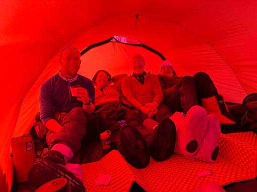Nights grew colder. Mornings became battles of layers and numb fingers. My phone froze and refused to charge until warmed inside a sleeping bag. Clouds rolled in. Some nights we gathered in a single tent - seven adults squeezed in sharing whiskey, cookies, and stories like "The Cremation of Sam McGee." Laughter came easier on those nights.