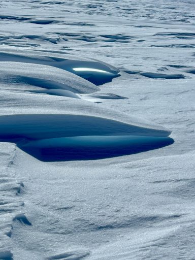 Heavy wet snow one day, soaring winds the next. We moved only when safe, sometimes not leaving tents until late afternoon. We built snow walls around our shelters; we shifted entire tents when the wind changed direction. One night the gusts reached 40 mph, condensation dripping steadily from the tent ceiling.